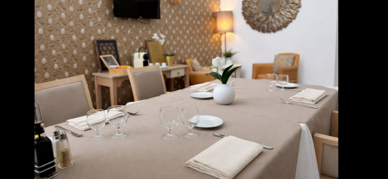 Nous accueillons les familles de nos résidents sur une de nos tables des invités, dans un petit salon agencé spécialement